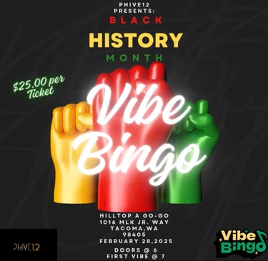 Let’s celebrate Black History Month in style! PHIVE12 presents Vibe Bingo, an exciting evening of music, trivia, and vibes, all in honor of Black excellence and history!